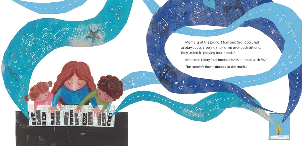 The boy and his family spend the next night and day remembering Grandpa and sharing stories with each other. From his stylish hats to piano duets, and apple squares for dessert, warm memories of Grandpa shine like stars with them while the yahrzeit candle burns – and continue to shine when it goes out.